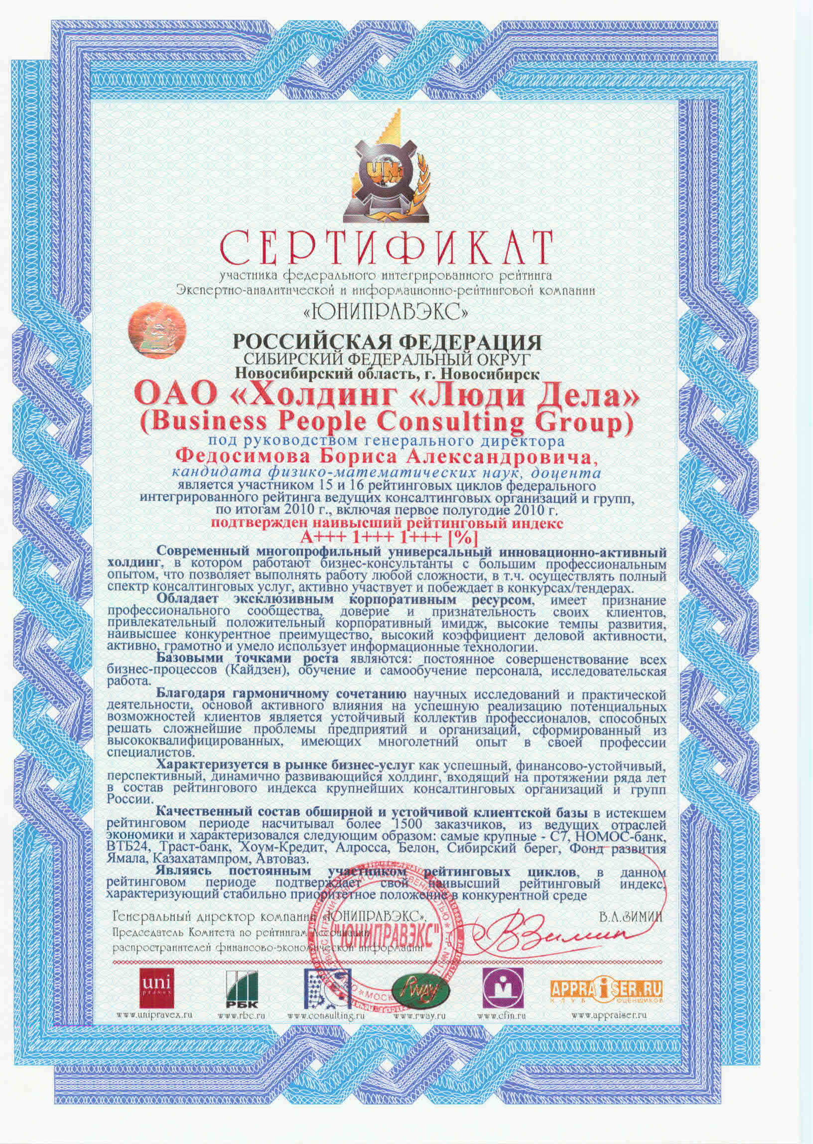 Сертификат, полученный от ведущей рейтинговой компании «Юниправэкс» подтверждает, что Холдинг «Люди Дела» является участником 15 и 16 рейтинговых циклов федерального интегрированного рейтинга ведущих консалтинговых организаций и групп, по итогам 2010 г., включая первое полугодие 2010г. И получает наивысший рейтинговый индекс А+++1+++1+++[%].